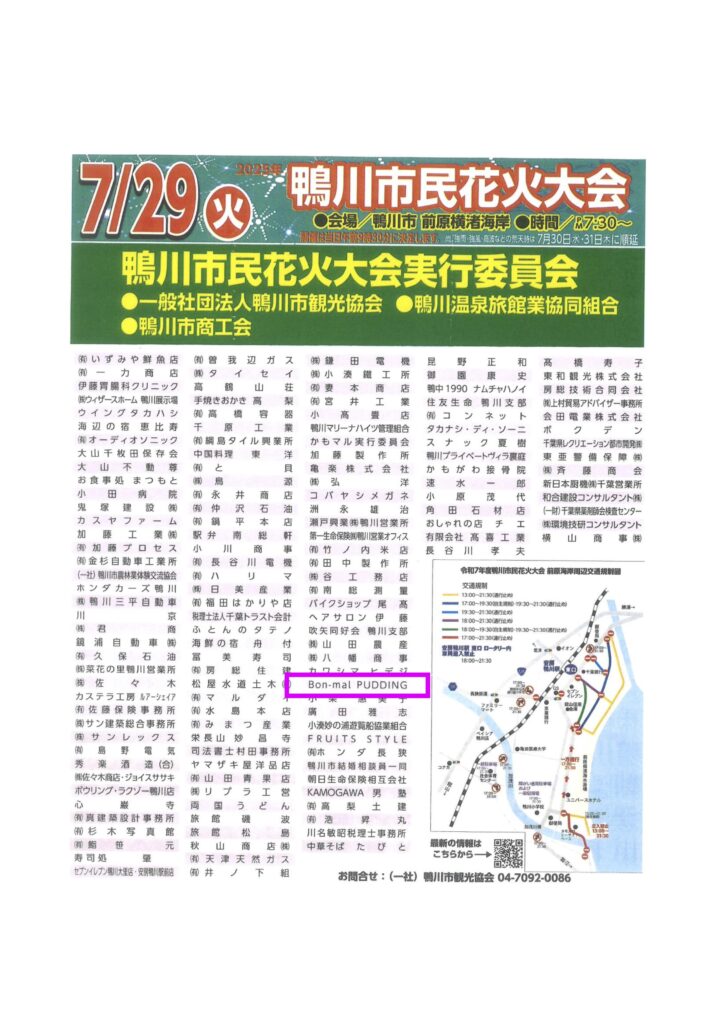 地元・鴨川の夏を彩る「鴨川市民花火大会」に協賛させていただきました。